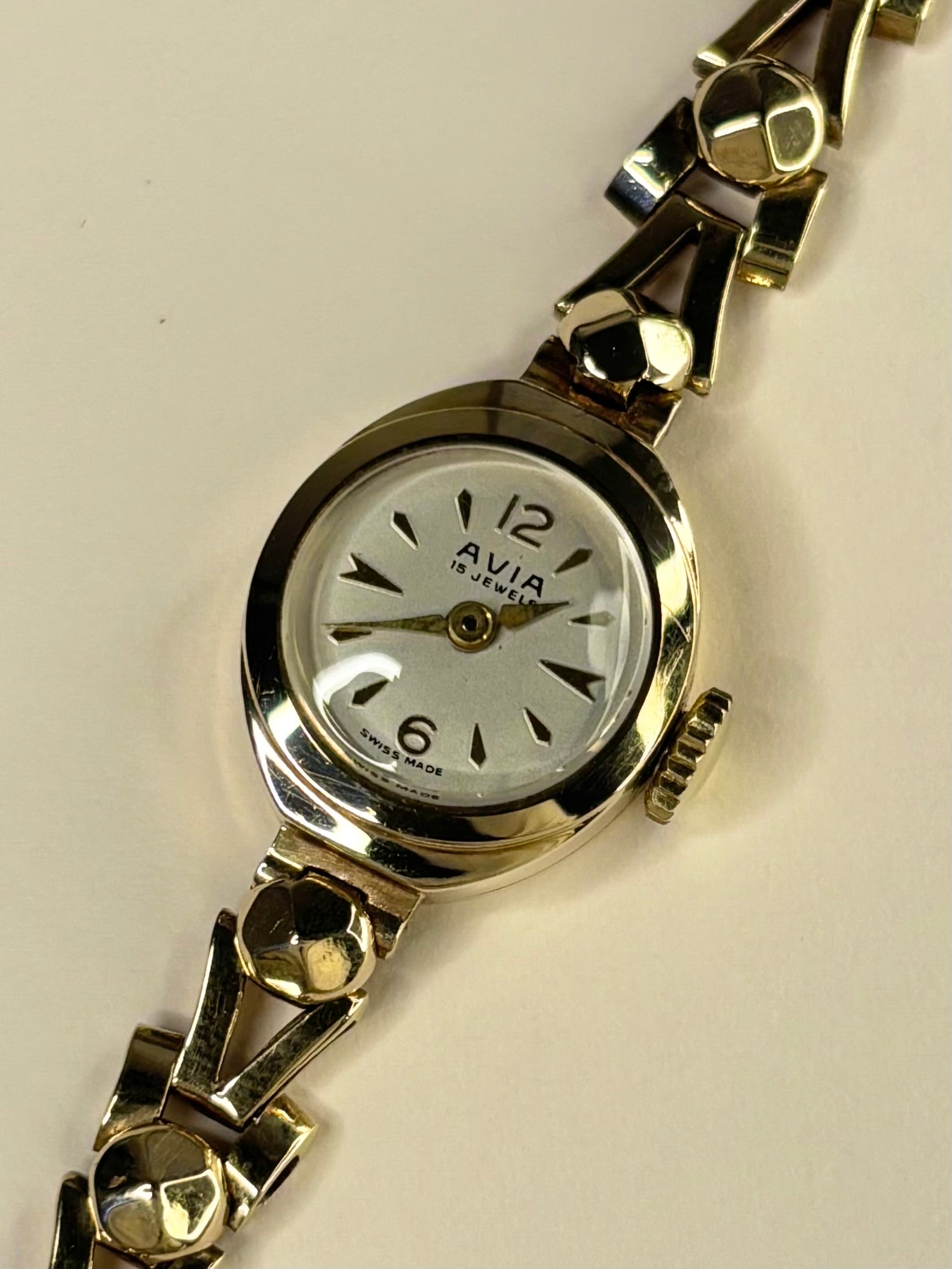 Here we have a gorgeous Avia solid gold ladies watch dating back to the 1960’s. As seen in the photos, both the white dial, the solid gold case and the solid gold bracelet are in superb condition! The Avia manual movement is keeping time to around 2 minutes over a 24 hour period. This watch also comes with its vintage sale presentation box - sold from a local Norwich jewellers almost 60 years ago! Make this beautiful solid gold Avia ladies watch yours today!