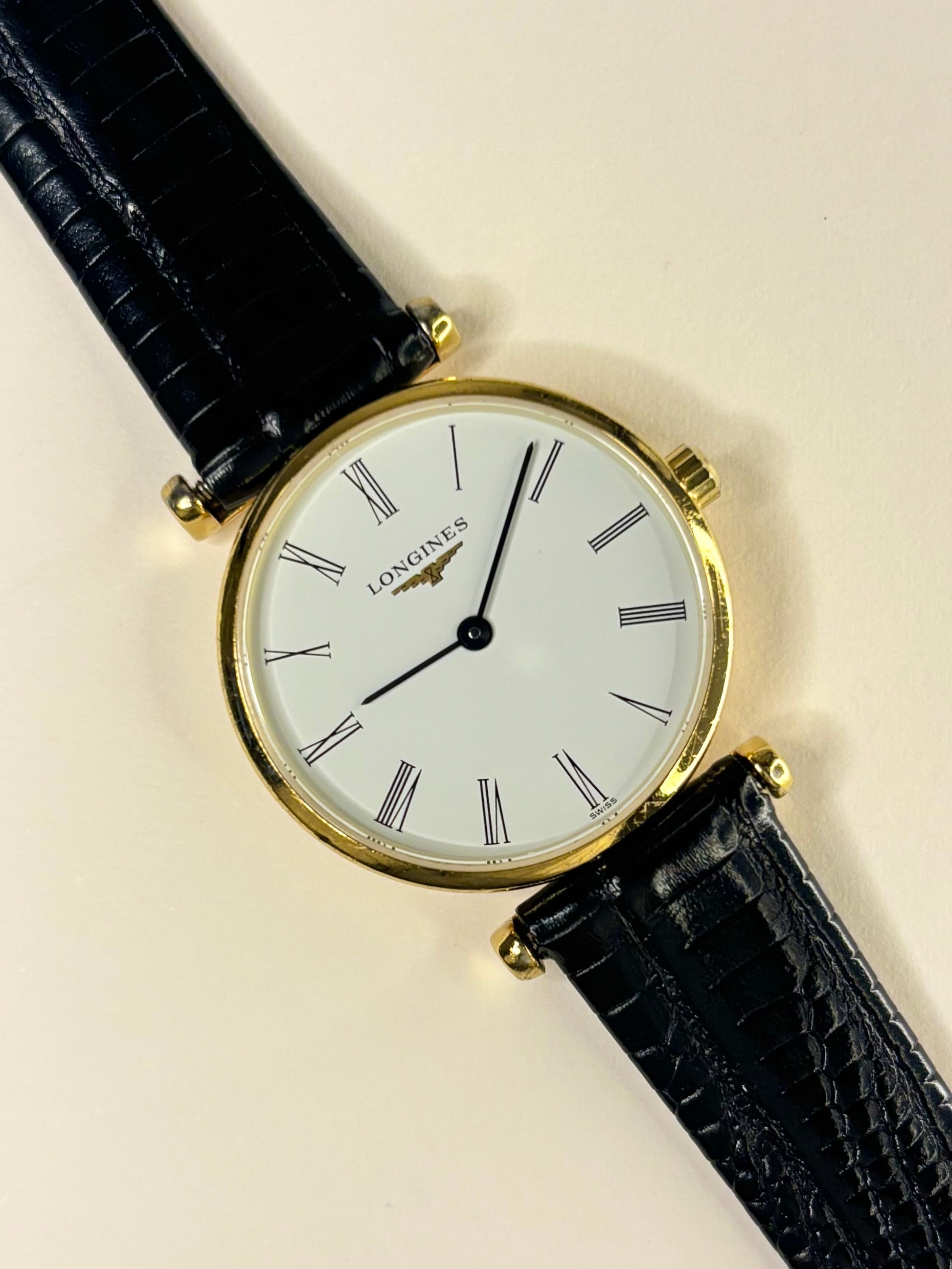 Here we have a gorgeous Longines ladies watch dating back to the 1990’s. As seen in the photos, both the white dial and the gold-plated case are in great condition. The Longines movement is keeping excellent time, as expected. Make this beautiful Longines ladies watch yours today!