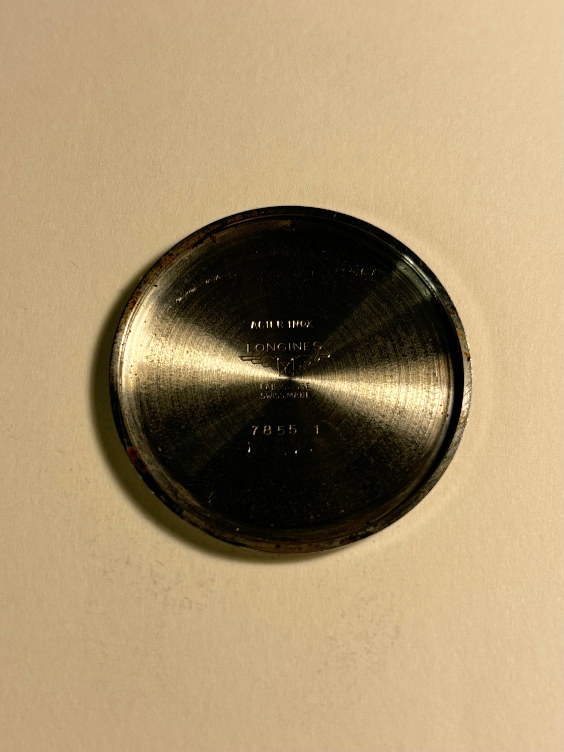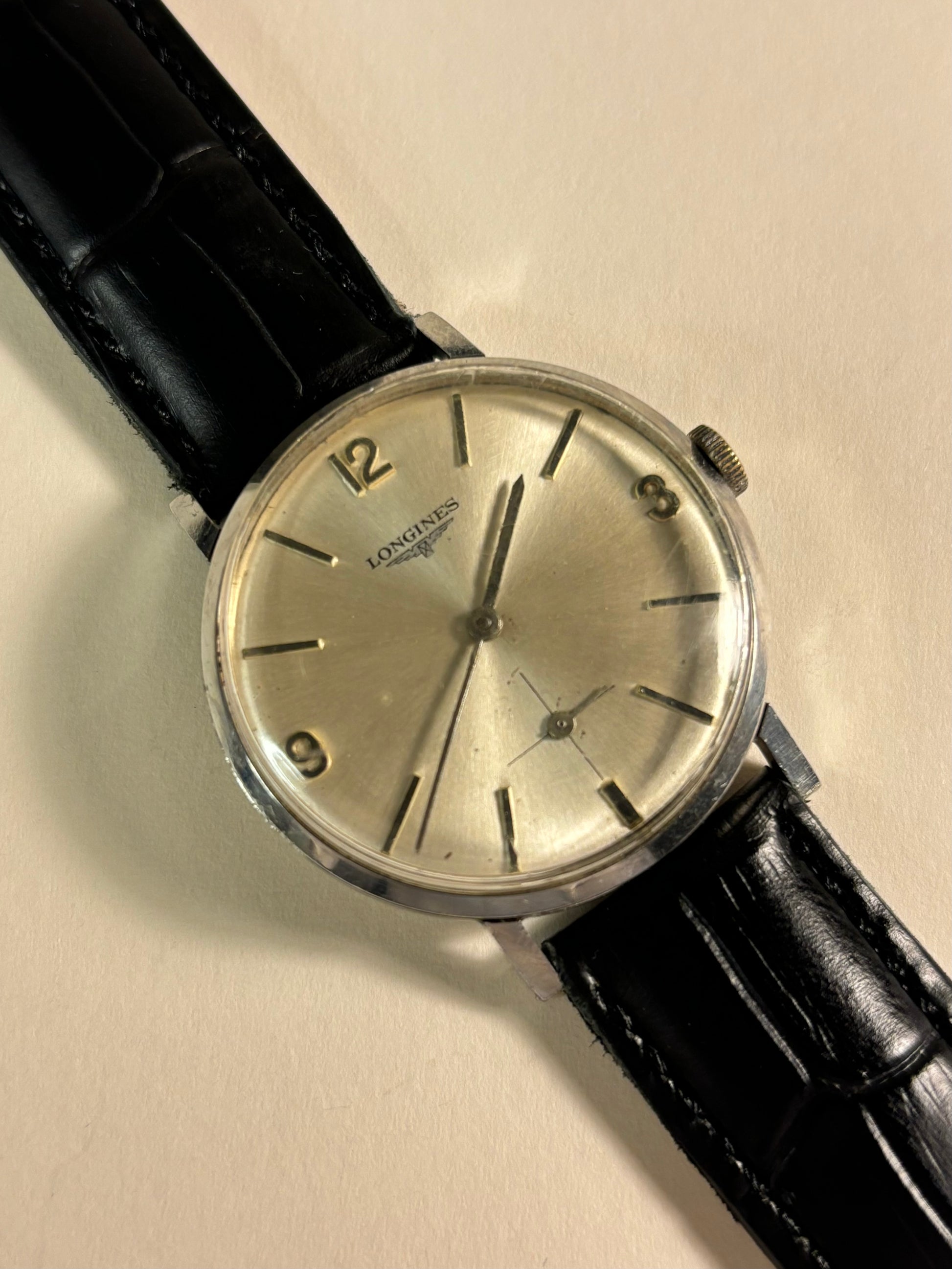 Here we have a beautiful Longines wristwatch from the 1960’s, encased in stainless steel. The dial shows a beautiful subtle patina in dots across the dial, characteristic of many vintage watches. The manual movement is keeping excellent time. Don’t miss out on your chance to own this gorgeous piece!
