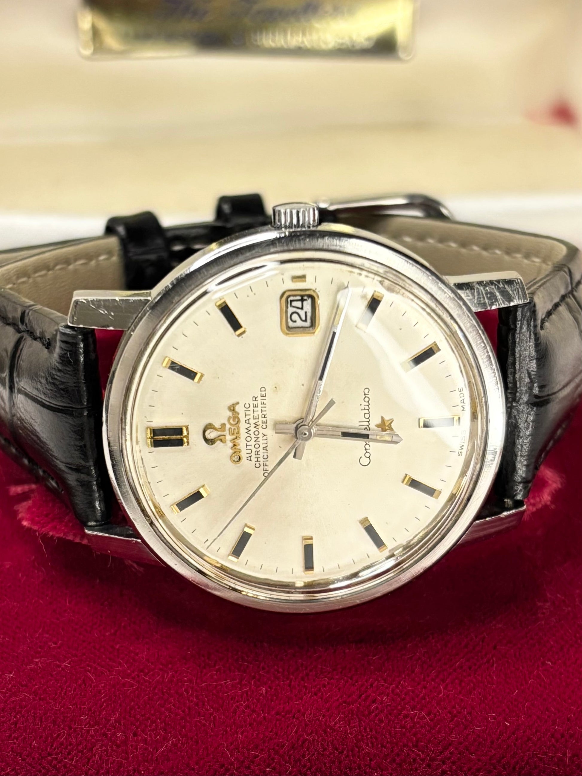 Here we have a gorgeous Omega from the iconic Constellation collection. As seen in the photos, both the stainless steel case and the white sunburst dial are in excellent condition, featuring minor marks commensurate with almost 60 years of cherished use. The Omega calibre 564 automatic movement is keeping superb time! Make this stunning Omega Constellation chronometer watch yours today!