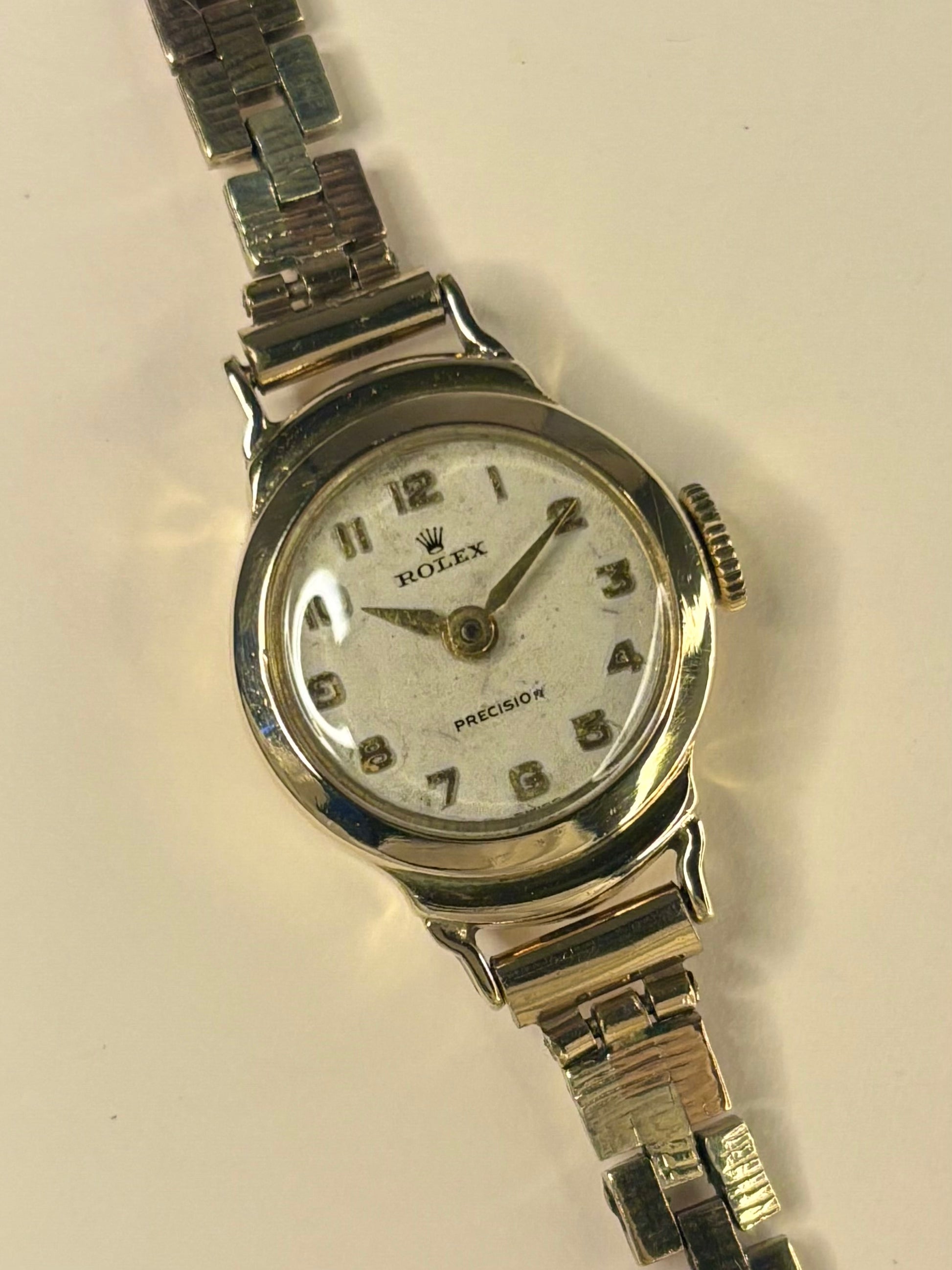 Here we have a gorgeous Rolex ladies watch from the iconic ‘Precision’ collection. As seen in the photos, both the dial and the 9ct solid gold case are in great condition. The 9ct solid gold bracelet is also in excellent condition. The Rolex manual movement is keeping time to just over 60 seconds over a 24 hour period. Make this beautiful 9ct solid gold Rolex ladies watch yours today!
