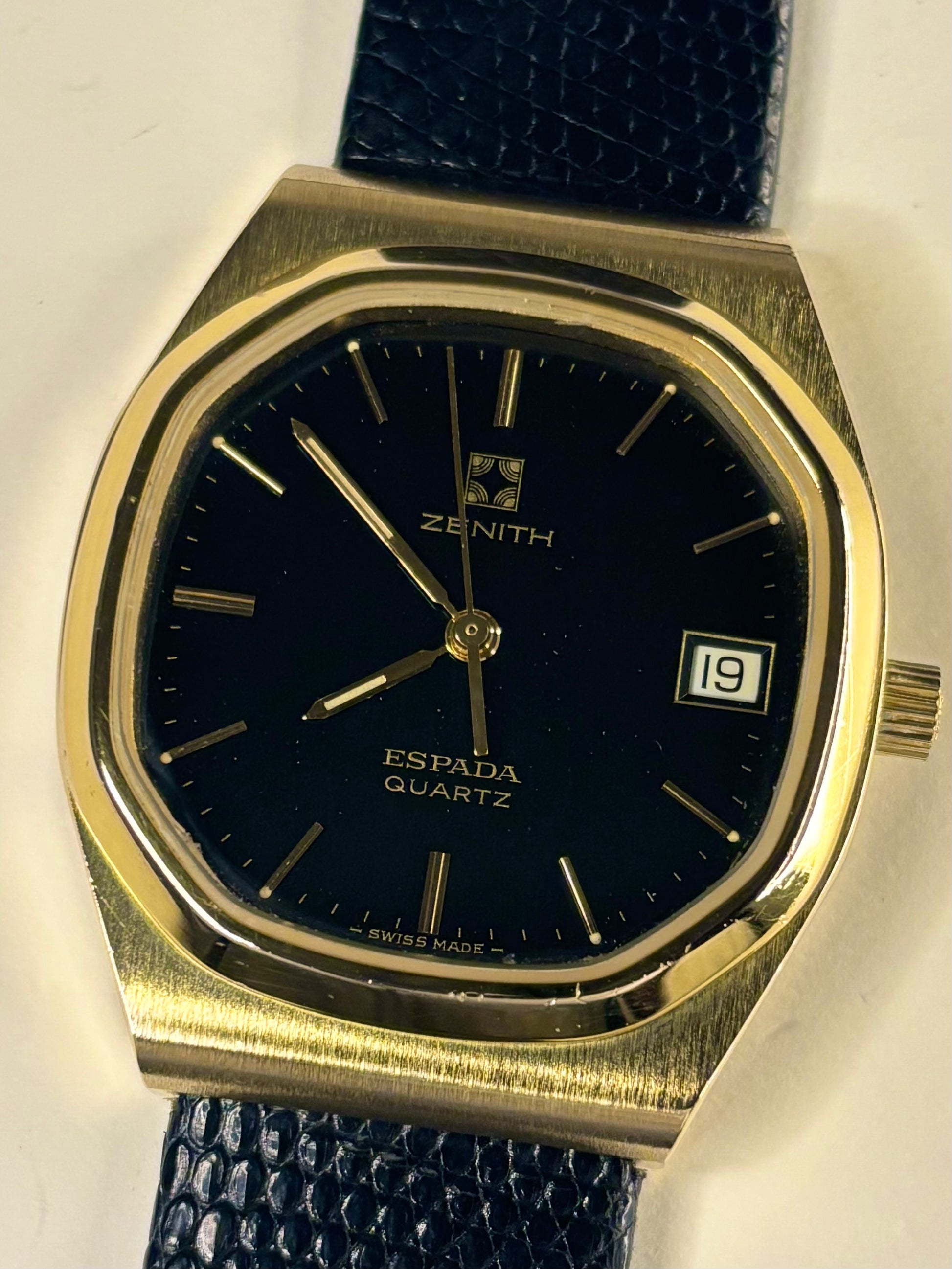Here we have a gorgeous Zenith dress watch dating back to the 1970’s. As seen in the photos, both the black dial and the gold-plated case are in great, vintage condition. The Zenith quartz movement is keeping excellent time, as expected. Make this beautiful Zenith dress watch yours today!